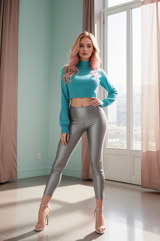 wide angle full body portrait of a british woman in a bright room with tall windows, entire figure visible head to toe, uncropped camera at eye level, lens pulled back, frame includes full body, ankles, and shoes with no she stands in contrapposto stance, weight balanced, arms relaxed, long legs extended she wears a cropped turquoise long sleeve sweater exposing waist, fitted yellow yoga pants, and pink shoes with rounded toes, stitching, reflective surfaces, heels and soles visible footwear grounded at the bottom edge with hard contact shadows and floor reflections, explicitly framed to prevent any cropping of shoes or feet her asymmetrical ash blonde hair falls to one side with pink streaks, rim lit flyaways catching highlights she gazes at viewer with timid allure, detailed eyes with catchlights, skin tones with subsurface scattering and pores sunlight streams across surfaces with volumetric haze and photometric depth locking footwear visibility at frame bottom