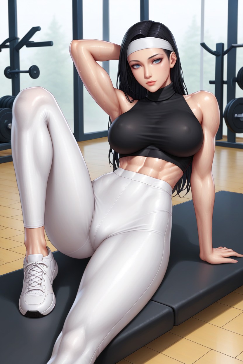 sexy woman, in her 30s, Russian, (black haired), long_hair, straight_hair, fit, athletic, (perfectly rounded breasts: 1.3), (firm breasts), (fake breasts), (bolt-on_implants), (large_breasts), sweaty skin, (turtleneck, (black crop top), sleeveless), covered nipples, (white yoga pants), white sneakers, white headband, in the gym, lying on gym bench, one leg up, stretching