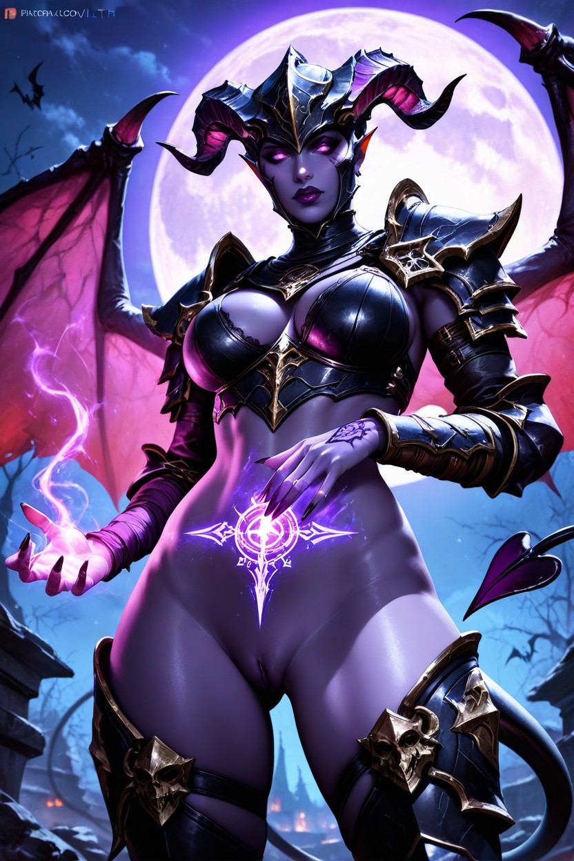 lilith from diablo iv, succubus, beautiful face, demon horns, big demon purple wings, demon tail, lean body, extremely waist, gothic, knight armor, full armor, full plate armor, tattoo, night, moon, purple moon, big moon, full moon, moonlight, counter light, magic spell, purple magical energy on her hands, purple cosmic lights, purple lights, purple aura, purple energy around her body, showing pussy, close up, ultra detailed realistic textures, dark fantasy art style
