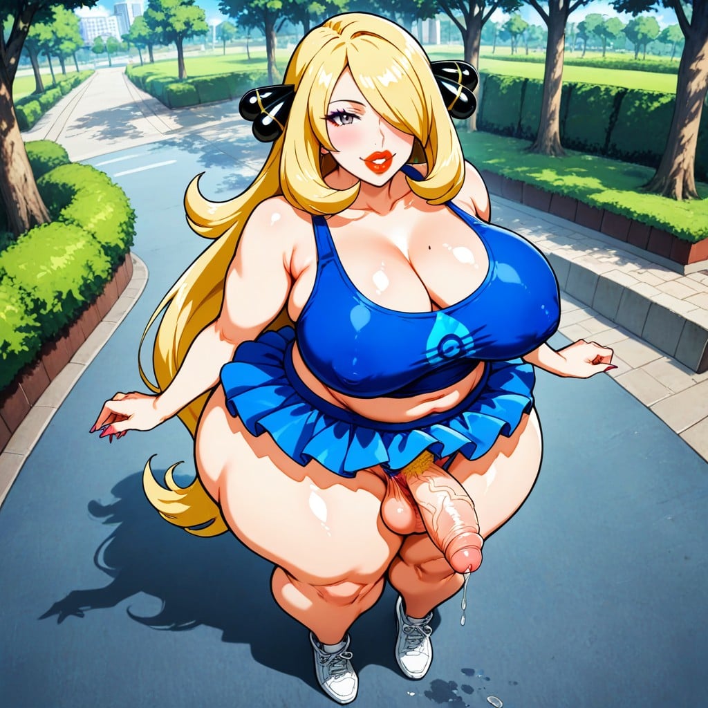 cynthia from pokemon, happy, chiibi proportion, highly expressive style, super-deformed proportions, shining highlights and soft pastel tones, humorous art style, satire, satiric, extremely simplified style, like a kndergarten drawing, comedic style, (super-deformed style: 1.3), chbi style, john, G-string, tutu, tank top with deep cleavage, erect penis, public hair, foreskin, precum, standing, park, knees together and feet apart