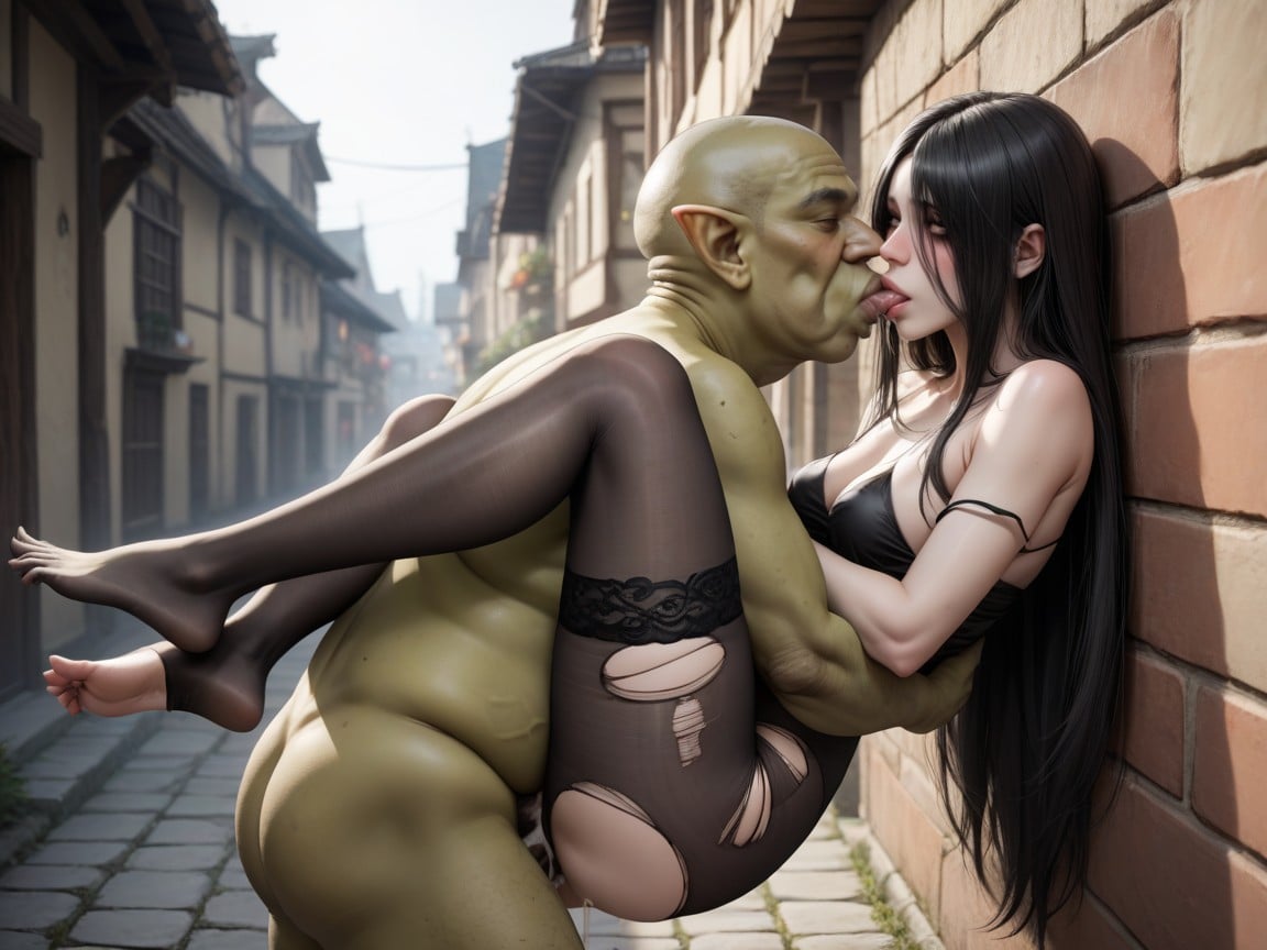 side view, full body shot, view from above, extremely realistic, tall Sadako on wall, pale skin, black hair, long hair, (long legs: 1.3), blushing, (happy: 0.9), outside goblin village, looking up, eyes rolling up, pale skin, (arched back: 1.2), open black transparent bodystocking off shoulder, torn clothes, legs spreading, leg lock, cum dripping, feet crossed, soles, half size ugly goblin kneeling, half size ugly goblin hugging her waist, his head on her chest, half size ugly goblin sucking her breast, breast sucking, missionary vaginal sex, carry hug, her arms hugging his head, goblin market