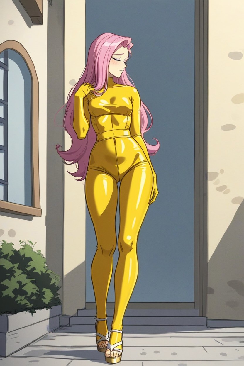 high resolution, solo, equestria fluttershy, fluttershy equestria, fluttershy, fluttershy style, equestria fluttershy style, low profile, lowest profile(lowest stature: 1.3), lower stature, low stature, fully dressed, wearing clothes, form fitting clothes, full body view, close up, sexy yellow pantyhose bodysuit, sexy yellow pantyhose costume, sexy yellow pantyhose costume, sexy high platform white sandals, very sexy yellow pantyhose bodysuit, very sexy yellow pantyhose costume, sexy yellow pantyhose costume, very sexy high platform white sandals, magic mlp village, mlp village, equestria village