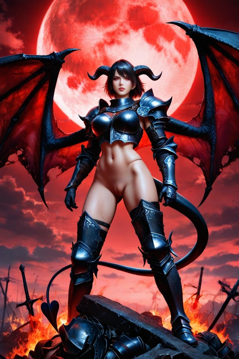 Iris amicitia from final fantasy, succubus, beautiful face, black hair, demon horns, big demon wings, demon tail, body, extremely waist, showing pussy, gothic, knight armor, full armor, full plate armor, standing splitting legs, night, red sky, red moon, big moon, full moon, red moonlight, red light, counter light, volumetric light, waist shot, clouded, clouds, after battle, battlefield, red flames, ultra detailed, hyper realistic textures, dark fantasy art style, ultrarealistic photo, photorealistic, hdr
