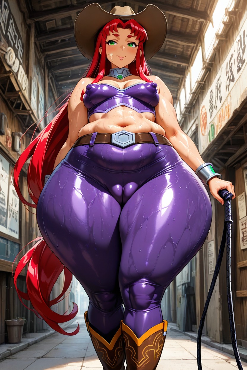 Starfire, huge thick thighs, fat legs, toned thighs, wide hips, tight strapless purple top, assless leggings, cowboy boots, cowboy hat, whip, skimpy, fat ass, shiny, wet, huge ass, whooty, pawg, very thick glutes, massive butt cheeks, big round booty, massive ass, hyper puffy nipples, puffy nipples, hyper camel toe, huge round butt cheeks, round hips, curvy figure, pear shaped body, ultra tight waist, massive cleft ass, extremely snacthed waist, long legs, very tall, deep ass crack, legs together, facing viewer, walking, sexy, front view, pose