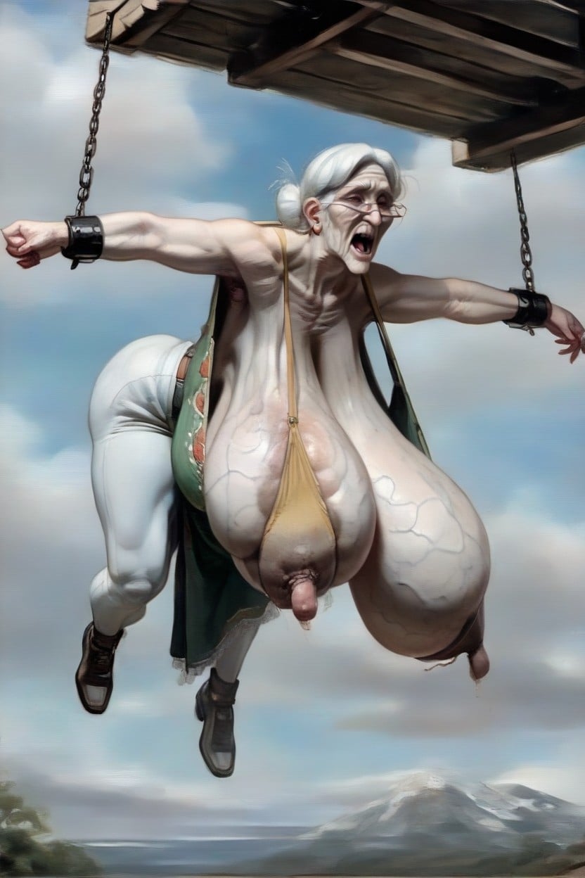 granny, huge boobs, downblouse, surprised face, massive tits, (saggy tits: 1.3), bouncing tits, (natural tits: 1.3), clear gaping nipple, very white skin, gigantic saggy breasts, hanging tits, (breast expansion: 1.3)breasts are hugely heavy, two huge breasts that are extremely heavy, extremely huge natural tits, ssbbw, Breasts are growing extremely quickly, solo, (veiny breasts: 1.3)hanging in air, restrained in air