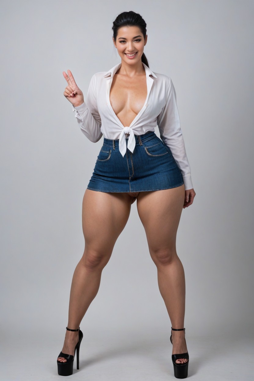Korean woman, completely naked, pale skin, black hair, hair slicked back, low ponytail, standing, looking left side, holding white sign, pointing at sign, smiling open mouth, supermodel, extremely beautiful, sexy eyes, perfect white teeth, fat cheeks, nude chest, perfect shaped hourglass body, shaved pussy, (massive thick thighs: 1.1), (massive strong quads: 1.1), (massive strong hamstrings: 1.1), unrealistically big huge muscled legs, bubble butt, (open white long sleeves collared shirt: 1.2), (denim skirt so it reveals her pussy: 1.1), (black platform shoes, black high heels: 1.1), gap between legs, front View, simple background, full body in picture, the whole body in picture, highly detailed