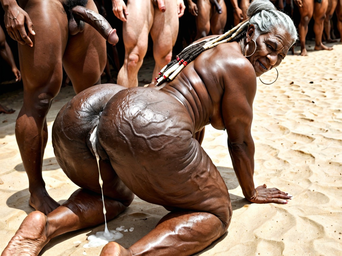 doggy style from behind, (18- bearded white male, huge oversized cockfuck a woman from behind: 1.3), white male on woman, (pull hair: 1.3), white man fucks from behind, jack o position, interracial, dreadlocks, tribal outfit, white man fucks dark-skinned woman, white man behind dark-skinned woman, white man looks at woman from behind, kneeling on desert floor, on floor, open-mouthed crowd in background, create cinematic portrait, (Big black African granny: 1.3), (African village: 1.3), wide nose, stocky body, round buttocks, thick thighs, (very hairy pussy: 1.3), huge ass, huge legs, hdr, big ass cellulite, (wrinkled face: 1.2), Photo in 5K HD quality, round female body, Amazonian silhouette, natural breasts, hourglass waist, very wide hips, (very big ass with lots of cellulite: 1.3), extremely wide and heavy buttocks, thick shapely thighs with cellulite, thick thighs, (extreme cellulite: 1.3), gigantic thighs, cellulite thighs, hips wider than shoulders, celluli