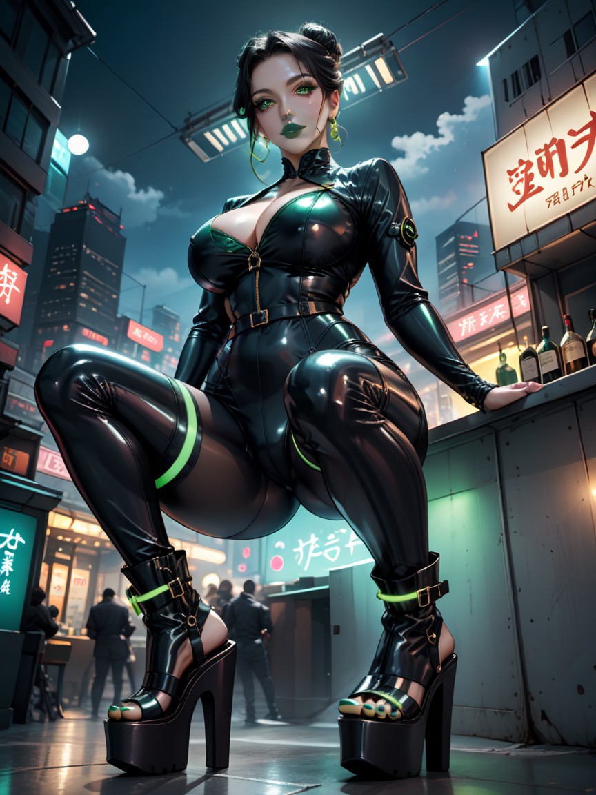 black haired female, one hair bun, beautiful face, round face, green eyes, wide eyes, green lipstick, puffy lips, bimbo, (tight full body black latex suit:1.1), (black open toe platform ankle boots with extremely high heels:1.3), bubble butt, kneeling, dark atmosphere, cyberpunk atmosphere, background is a futuristic japanese bar, bright neon lights