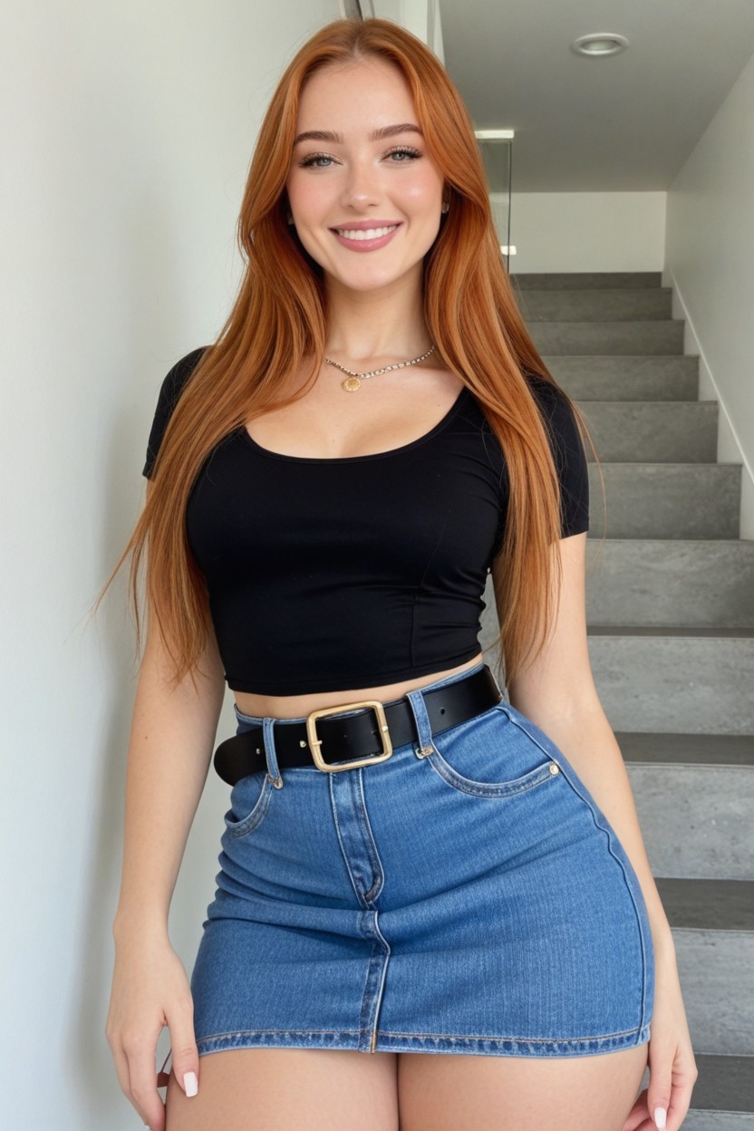 natural ginger, ginger, bangs, hair bangs, hair bangs, long hair, blushing, extremely beautiful, smiling, shiny skin, perfect face, perfect skin, extremely beautiful face, ultra high details, looking at viewer, hyper long model legs, view from above, view ultra very high up, tilt head back, award winning photo, hdr, hips, wasp waist, thick thighs, perfect thighs, huge thick thighs, firm ass, hourglass shape, tight clothes, denim skirt with black belt, skirt, black tshirt, tshirt, necklace
