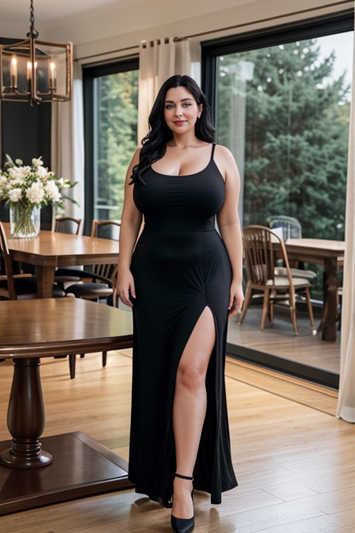 Elsa from frozen, 50+, Curvy thick black haired woman with blue eyes, huge natural saggy breasts, breast expansion, curvy hips, pale white skin, thick thighs and calves, wearing a long black dress, (long dress), oversized dress, flowy dress, wearing black pantyhose, (black pantyhose), pantyhose legs, pantyhose calves, pantyhose feet, walking into dining room, brown dining room table in background, big windows, late at night with low light