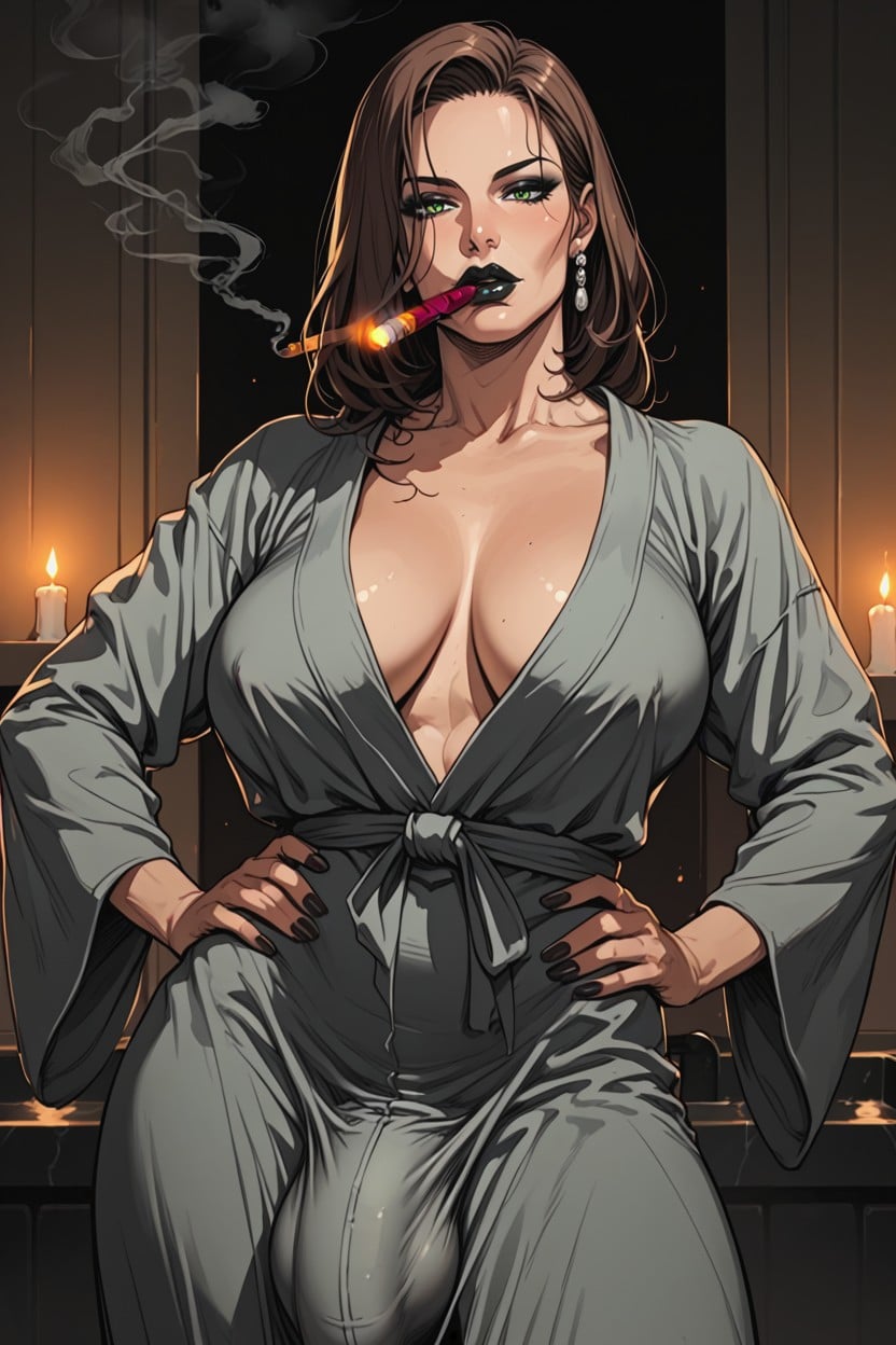 (cigar in lips: 1.3), hard penis in robe, (massive penis bulge), 50s, smoking big cigar, mature futa, american, brown hair, black fingernails, green eyes, black lipstick, black eyeshadow, a cigar dangling from her lips, (staring at viewer), wearing bath robe, (big bulge: 1.3), (big abs), fat cock bulge, veiny bulge