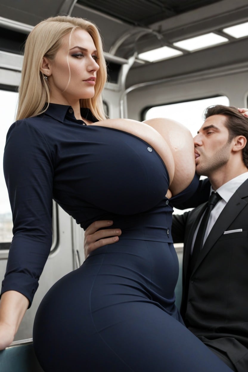 hyper busty womans shirt has high collar and is buttoned all the way up, fully clothed woman has colossal tits in very tight shirt, photorealistic man rubbing his rock hard cock cumming on her skirt while she gives him handjob, man standing next to a woman getting a handjob, man getting jerked off, she is looking at his dick, on the train, woman has colossal ass in tight skirt, woman is fully clothed form fitting clothes, no cleavage, breasts in shirt, body is ultra curvy with super tight clothes, detailed face, face, blonde hair, extremely sweaty, cumshot, friend watches the scene embarrassed, she is looking at his dick