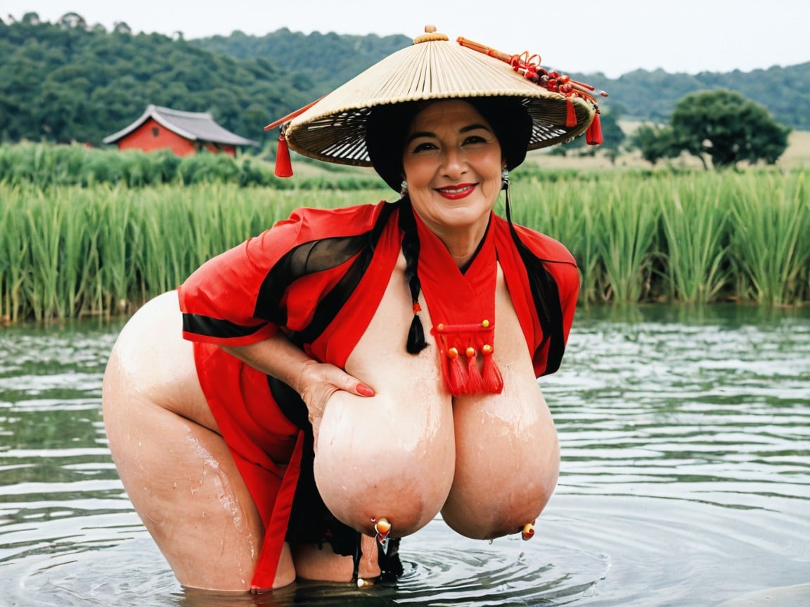 Hot milf, gorgeous, beautiful, sexy Elderly gilf, Douli, chinese rice, large conical hat, Black hair, milf elderly sexy gilf, (pale skin: 1.1), sweaty, wet shiny skin, working harvesting, bending over, water up to her mid thighs, partially submerged, full body view distance, rice field, partially clothed, bottomless, traditional clothes, horny expression, eyes on viewer, seductive expression, pussy exposed, slightly, damp clingy clothes