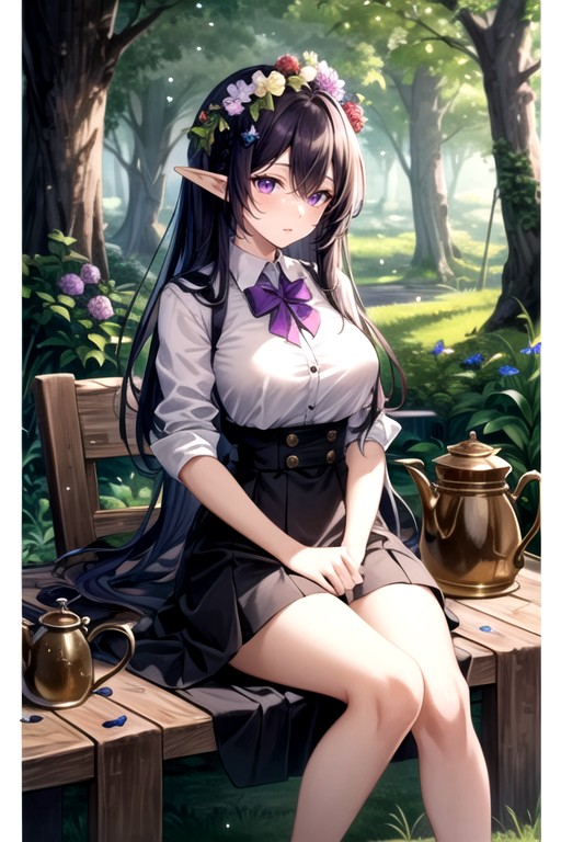 A Woman Elf In Forest With Dark Purple Hair And Flowers On Her Head And Purple Eyes And A Purple Bow And A Long Cream-colored Stein Shirt With Buttons On The Bottom Of The Skirt ИИ порно