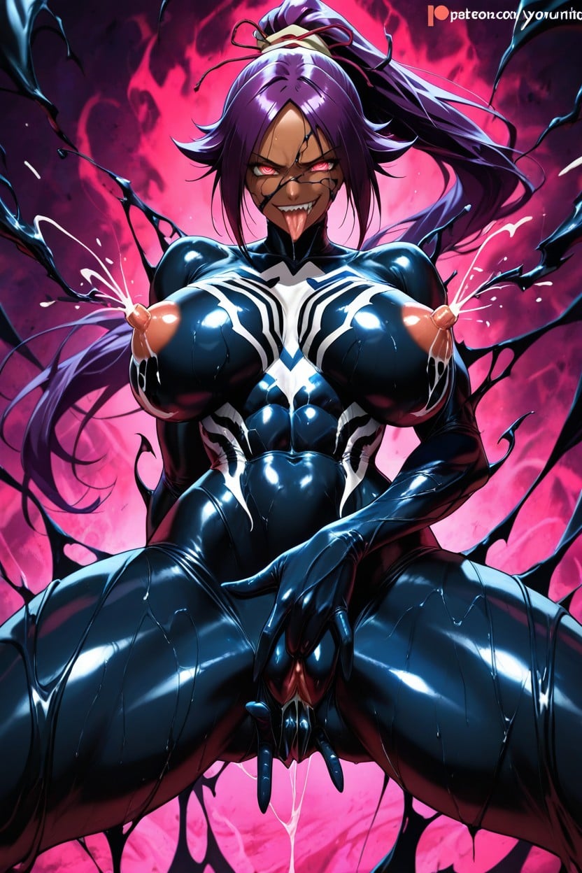 Venom from Venom, Yoruichi, corruption, massive breast, wasp waist, large ass, extra slippery, seducing, model pose, dominant pose, symbiote, under venom's control, covered by symbiote, classic venom, face free from symbionte. Long nipples, big nipples. Hairy pussy, big open pussy, camel toe. Corrupted eyes, spiral eyes. tongue out. Wet pussy, nipple dripping milk.