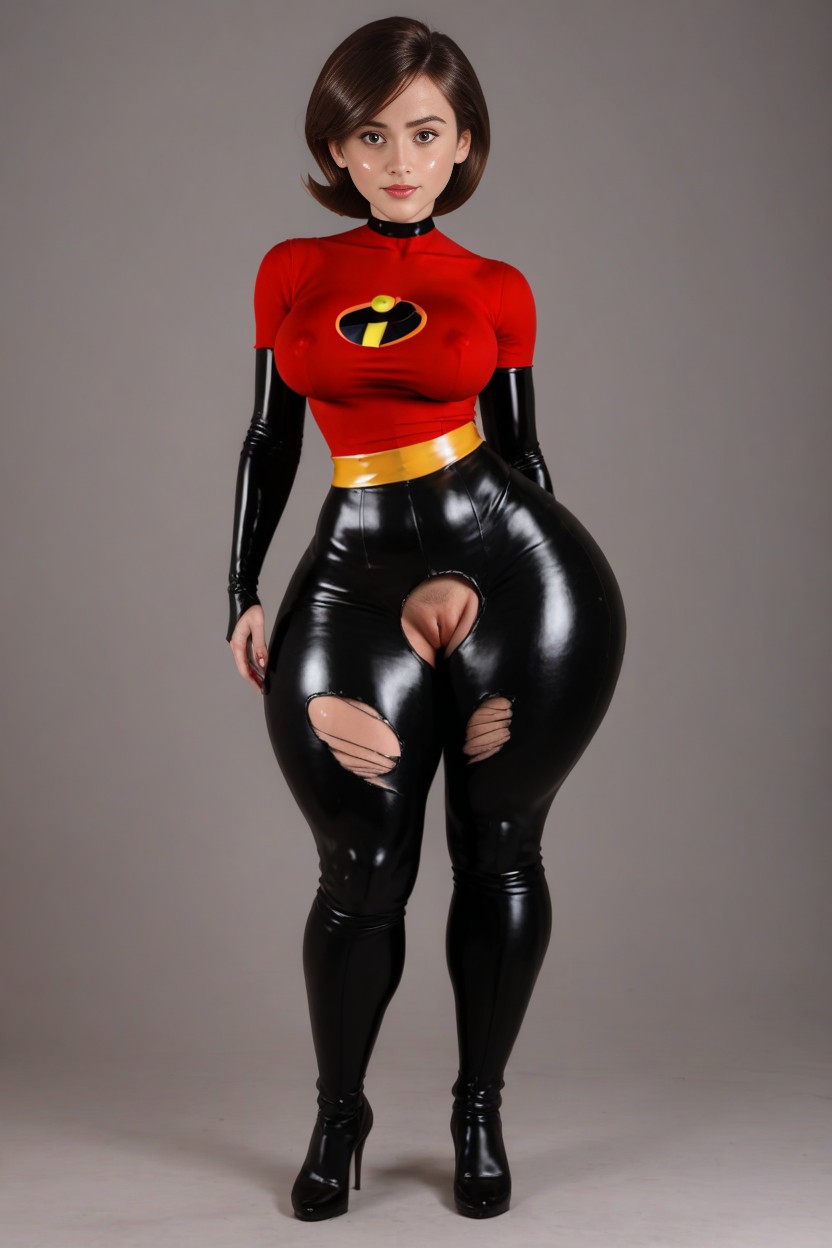 helen parr from incredibles, standing, incredibles outfit, superhero outfit, hd, full body, front view, giant ass, ultra wide hips, hdr, extremely beautiful, front view, big extremely round buttocks, extreme bulging butt, looking at viewer, waist, flirty, round eyes, brown eyes, hyper ass, hyper thick thighs, thick thighs, bubble butt, bbl, bulging ass, round ass, large ass, torn clothes, shaven pussy showing, pussy showing, puffy pussy