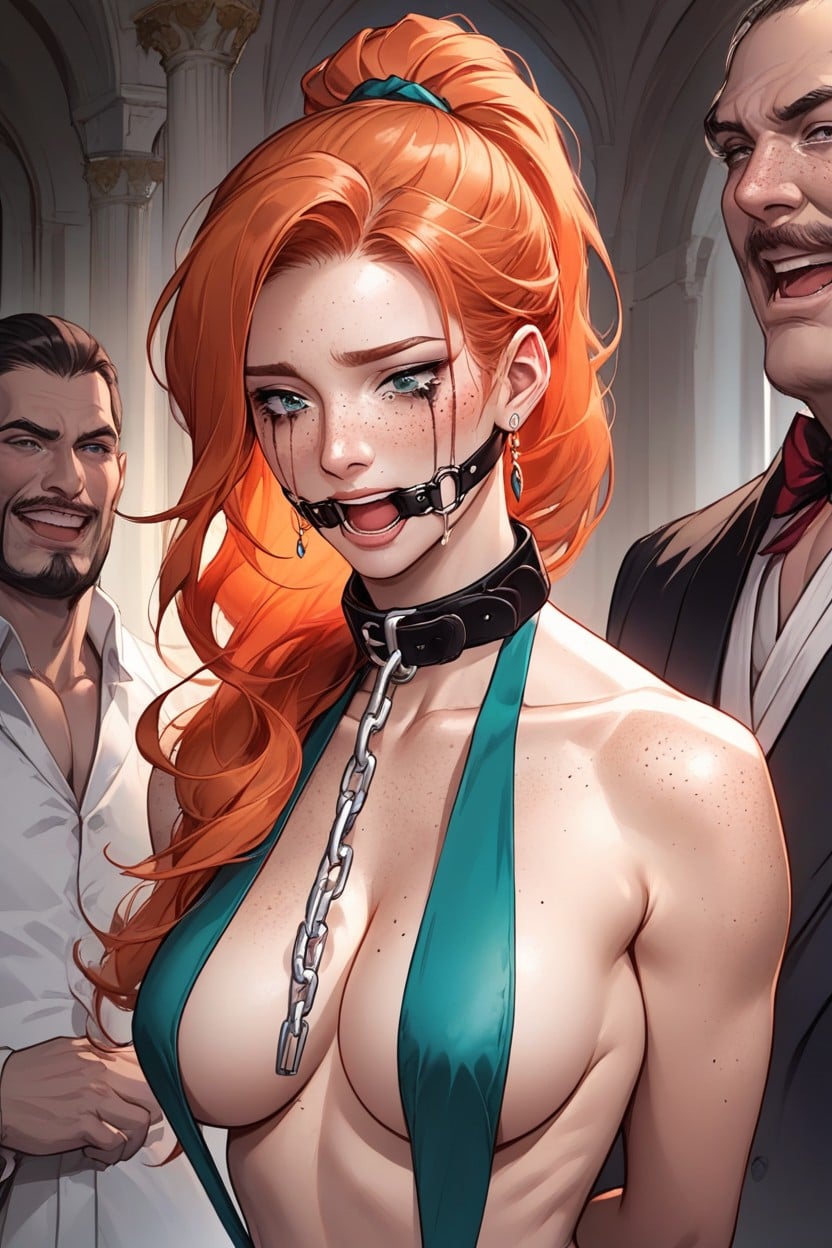 ginger woman, beautiful face, ponytail, mouth open gag, open gag, mouth wide open, woman looking down, pleading look, ruined mascara, eyes wide open, collar with chain, dark green sling bikini, (three old men around her: 1.1), men looking at her, men elegantly dressed, ultra detailled, ultra detailled picture