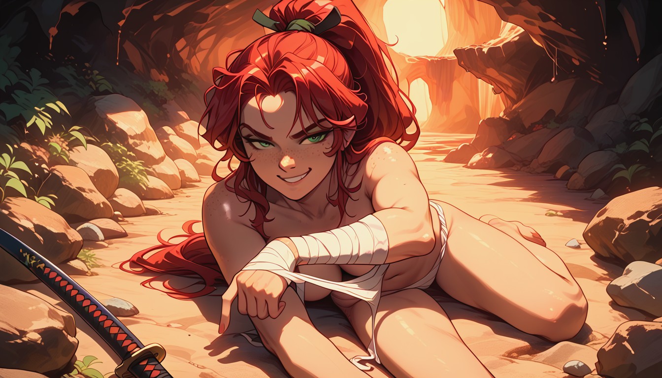 得意的表情, 洞穴, Red Hair Ponytail Green Eyes Bandage Naked Nude Katana AI黄片