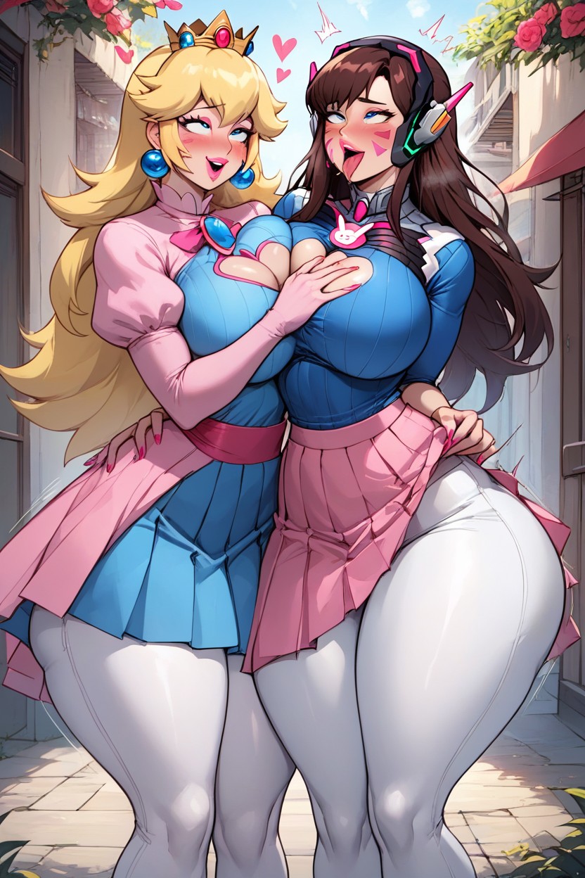 holding your chest, bodies together, Lesbian, Princess Peach, chest out, Blushing, Fully clothed, very Big ass, very Big hips, neckline, D.Va From overwacth, Very wide hips, full original skin, standing, open eyes, blue eyes, horny, slutty, pink lipstick, pink nails, pink eyeshadow, motion lines, wide hips, big ass, big breasts, big breasts, big ass, fully clothed, ahegao, tight skirt, pleated skirt, pose, blue top clothing, perfect figure body, love hearts, moaning sound effects, perfect face, perfect figure body, rounded ass, rounded breats, tigh clothing, heart-shaped opening in the chest