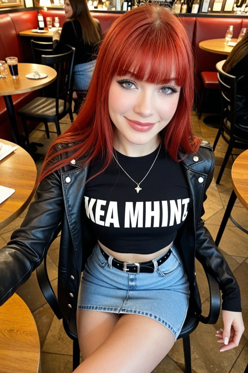 white skin, light skinned woman, albino skin, japanese idol, blunt bangs, red hair, long hair, blushing, goth, ghost white skin, wonderful, goddess, blushing, extremely beautiful, smiling, shiny skin, perfect face, perfect skin, extremely beautiful face, ultra high details, looking at viewer, black combat boots, standing, full body view, award winning photo, hdr, hips, wasp waist, thick thighs, perfect thighs, firm ass, hourglass shape, denim skirt with black belt, (skirt:1.3), black leather jacket, black tshirt, tshirt, necklace, high angle view, full portrait, sitting inside a restaurant, sitting down, crossed legs