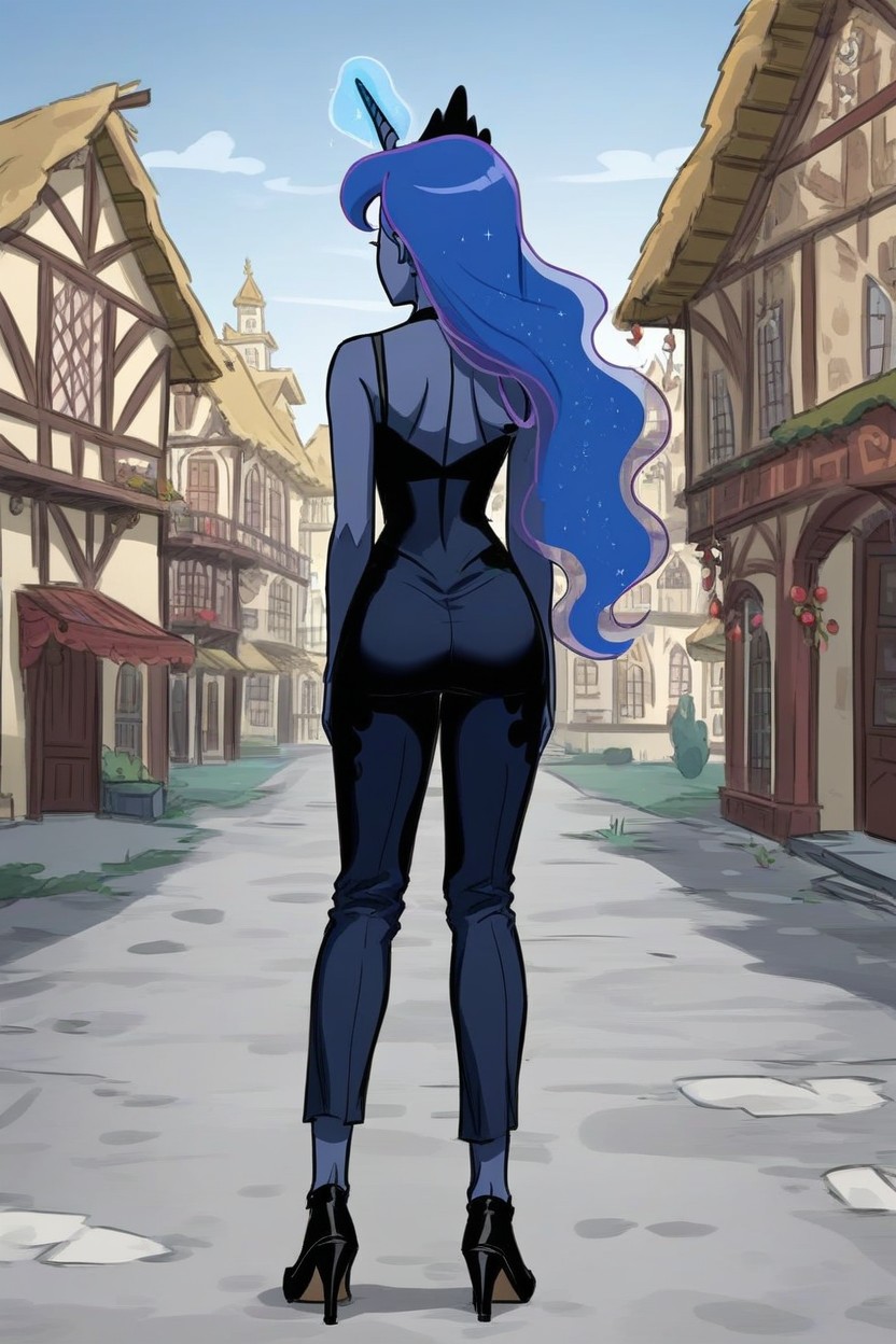 high resolution, solo, equestria princess luna, princess luna equestria, lore accurate princess luna equestria, blue skin tone, fully dressed in sexy clothes, wearing sexy clothes, fully dressed in very sexy clothes, wearing very sexy clothes, full body rear view, rear view, magic mlp village, mlp village, equestria village