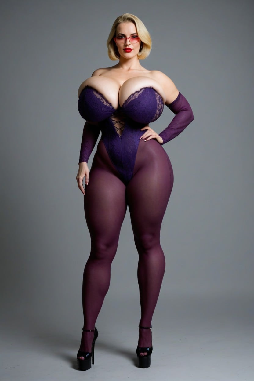 cathy canuck the super milf, cathy canuck, cathy canuck, cathy canuck cathy canuck cathy canuck, cathy canuck, cathy canuck the canadian super heroine, giant boobs, extremely huge tits, huge boobs, giant tits, blonde cathy canuck, red glasses, wearing a purple lace and white frilly bodysuit, purple lace and white frilly bodysuit, white platform high heels