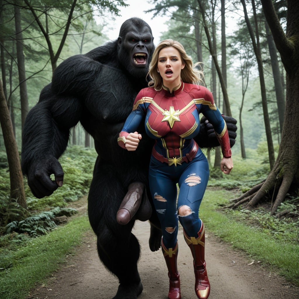 Super resolution, one adult Gen Z female, recent adult, curvy, girlfriend-like face, virgin, big attractive blue eyes, very large anime-like eyes, (Captain Marvel: 1.3), (massive beast like king kong: 1.2), (running fast: 1.3), Woman Running At Top Speed, chase, moving, torn costume, (black beast behind Captain Marvel: 1.2), giant massive beast like King Kong, running away from beast, A giant beast can be seen over the woman's shoulder, beast with huge black penis, abnormally hyper giant beast erect penis, giant beast like King Kong behind her, The beast is chasing the woman, roaring.in a dark forest, exposed puffy nipple. exposed pussy. pubic hair. waist shot.