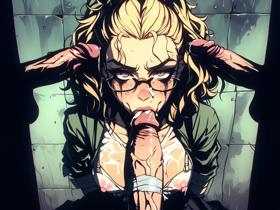 wet mouth, wet lips, spit, drool, wet fingers, sticky fingers, motion lines, leaning back against wall, head against wall, exposed cleavage, spit on clothes, drool on clothes, olive green field jacket, black skirt, white bra, nipple exposed, pov, looking up at viewer, licking shaft on big penis, big penis covering face, deepthroat, 2 penises, multiple penises, pre cum, wet penis, juicy penis, gangbang, blowjob, blowbang, duct tape, duct taped arms