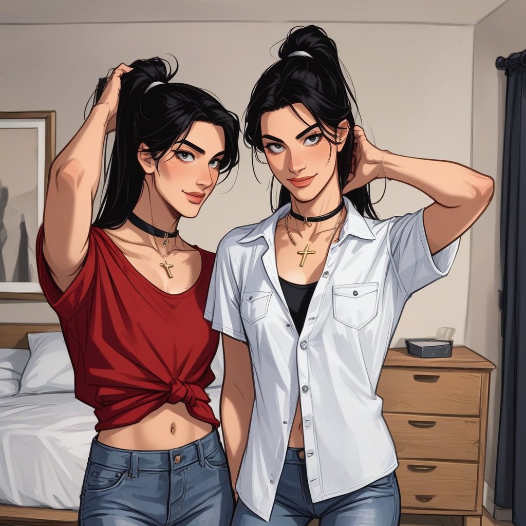 art by shirow masamune, modeling, identical twins, good woman and bad, differing clothing, standing side by side, shirt and jeans, in bedroom, smiling to camera, one wearing a cross necklace and the other wearing a collar, both have black hair in ponytail, full lips, large eyes, super figure, mulan face