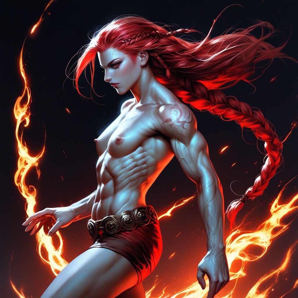 androgyne body, red hair, long braided hair, beautiful seductive pose, strong, fiery look, lean body, perfect body, pale skin, man, androgyne, night, dark background, mysterious, large belt, fur tasset, ultra realistic, award winning photograph, lustful gaze, running, side view, front view, dynamic picture, naked