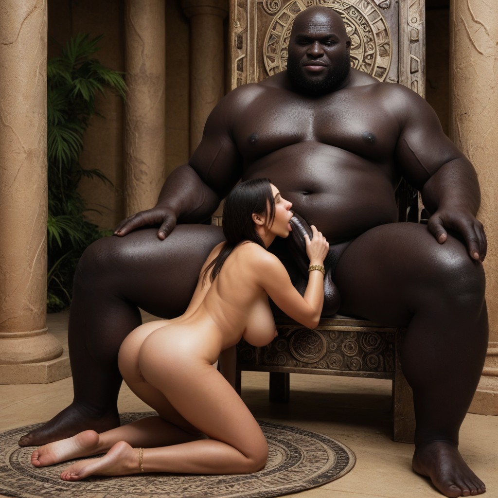 fat bald ugly tribal black man, grorilla bald fat ugly black man, grorilla bald fat ugly black man, sitting on throne, big fat black man with big black cock, big gorilla bald black man, grorilla bald fat ugly black man, long dark penis, enormous erect cock, gigantic penis, big balls, cortana from halo stand on all fours surrounding throne in steel collar with chain leash front of nude dark fat gorilla man, nude dark fat gorilla man hold leash in hand, golden bracelets on arms and legs, gold earings, round natural breasts, round ass, naked, rounded bubble butt, erect nipples, blowjob, deep in her mouth, licking balls, ancient temple, jungle temple in background