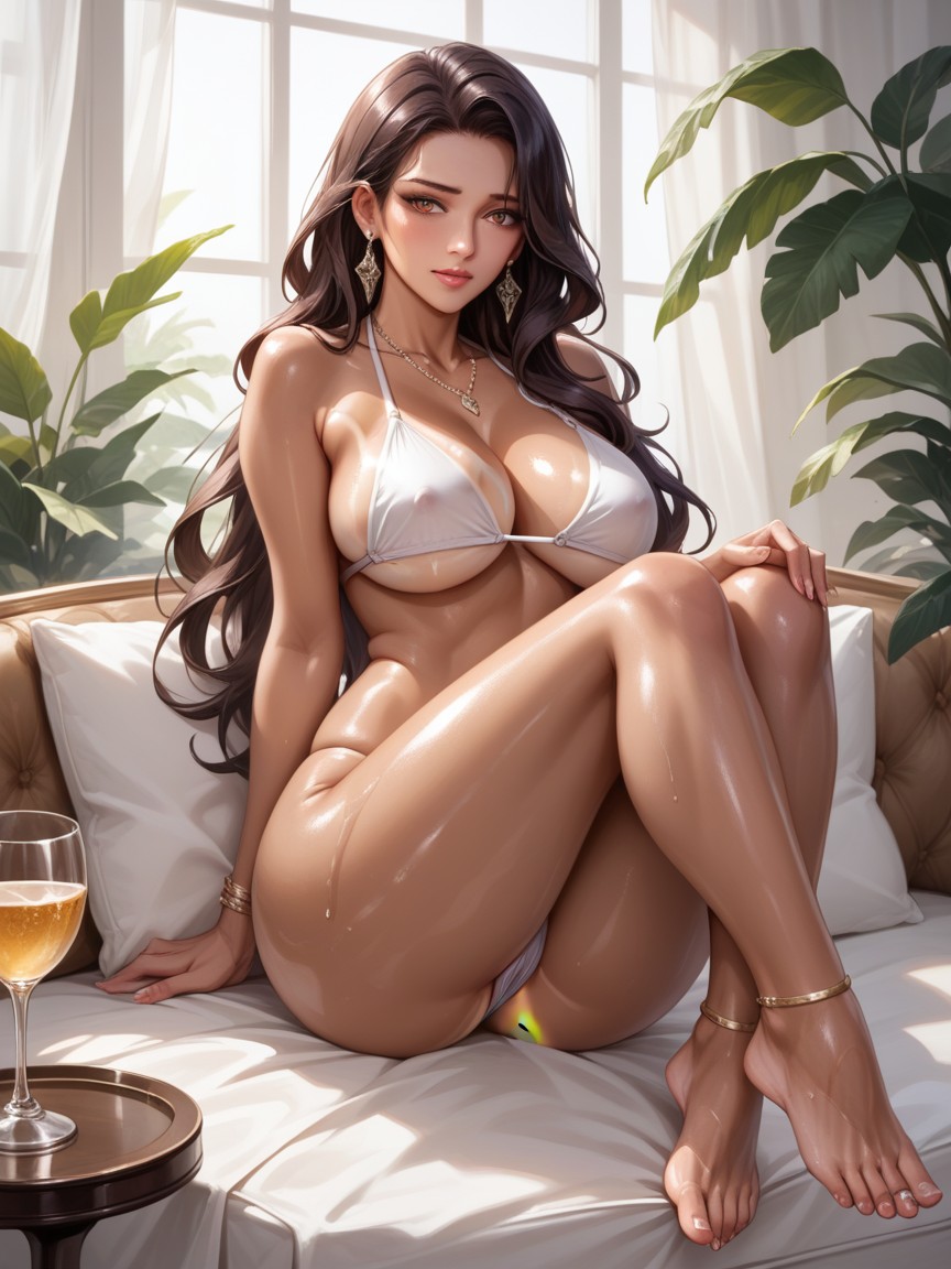 highly detailed image, image, high definition, high resolution, award winning images, beautiful female, long hair, bangs, embarrassed expression, bare feet, anatomically accurate feet, large round breast, erect nipple, hourgalss figure, round ass, pale skin, hands covering vagina, topless, enmbarrassed expression