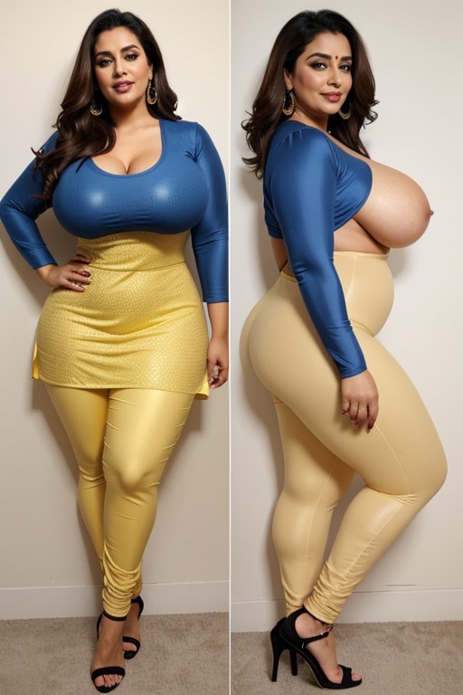 Beautiful and sexy plus size Woman, curvy and thick, large breasts, huge cleavage, mammoth milky breasts, thick thighs, sexy thick legs, huge round ass, curvy thick ass, wearing yellow kurta, sexy thick backless kurta, backless, thick back exposed, knee length high slit kurta, indian Pakistani kurta, tight kurta, blue leggings, blue sexy leggings, stilettos, jewelery, bangles, Pakistani ethnic wear, tight kurta, standing, front view, full body, posing.