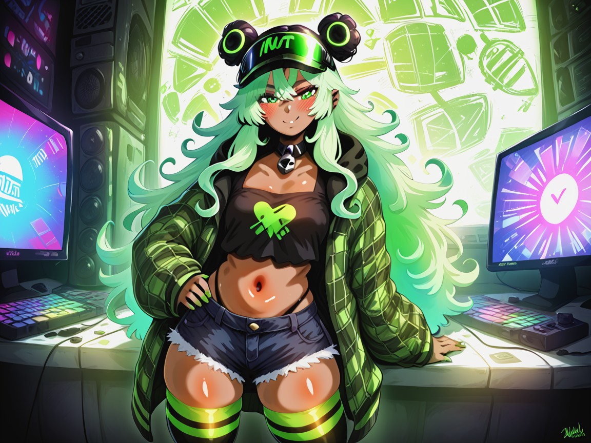 nsfw, glitch techcore aesthetic, workstation background, neon green computer monitors, golem dolls, led green lights in background, heavy green makeup, heavy wingtip eyeliner, high blush, large eyes, vtuber, one woman, dark ebony skin, black curly hair, energetic face, rectangle body type, squared shoulders, squared torso, chest and hips proportionate, squared chest width, squared breast width, asymmetrical breasts, squared abdomen, wide proportionate waist, low torso height, squared hips, squared ass, squared thighs, wearing pastel green plaid layered emo clothing, oversized plaid hoodie, asymmetrical neon green thigh highs, mech headset, glowing pastel green visor glasses, vibrant saturated colors, high color contrast, pastel color palette, clothes ultra detailed, afterimage, e woman art, glitch effects, crt screen
