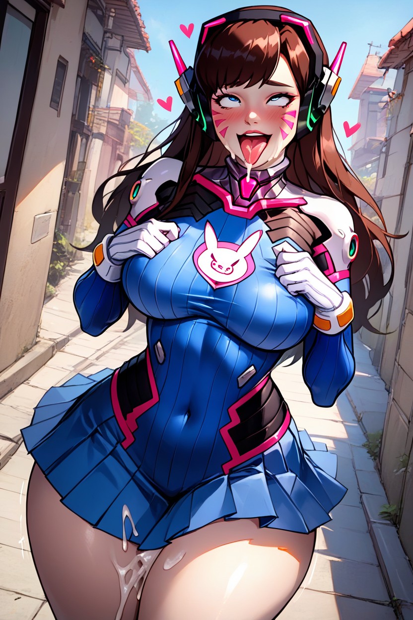 Bbw, Ahegao, Open mouth, out tongue cum in chest, hourglass body, Standing, Very wide hips, rounded ass, D.va original skin, very tight skirt, blue skirt, prominent hip, Blushing, Fully clothed, very Big ass, very Big hips, neckline, D.Va From overwacth, Very wide hips, full original skin, open eyes, blue eyes, horny, slutty, pink lipstick, pink nails, pink eyeshadow, motion lines, wide hips, big ass, big breasts, rounded breats, big breasts, big ass, fully clothed, ahegao, tight skirt, pleated skirt, pose, blue top clothing, perfect figure body, love hearts, moaning sound effects, perfect face, perfect figure body, rounded ass, rounded breats, cum on face, tigh clothing, heart-shaped opening in the chest.