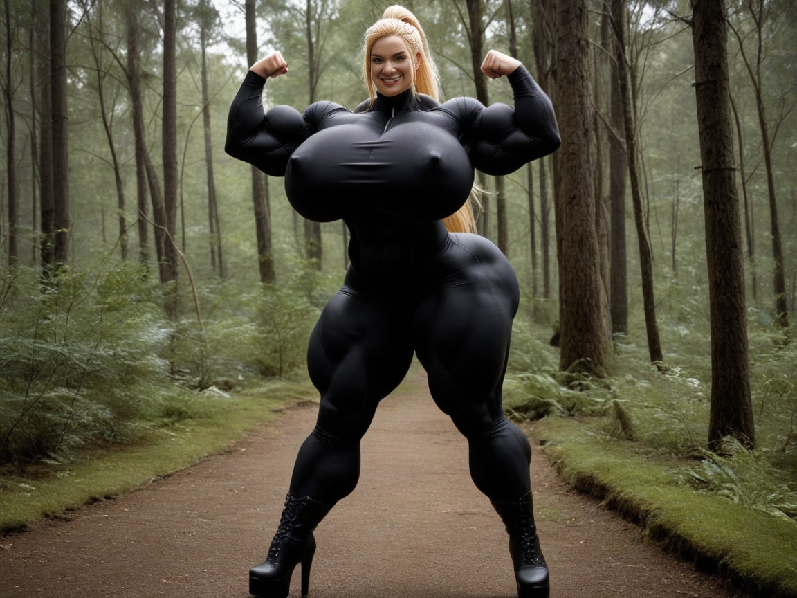 fully clothed, shiny long sleeve catsuit, tight long sleeve fitness shirt, blonde hair in ponytail, full body, forest, hypermuscle, gigantic muscles, platform high heel boots, hypermuscle, gigantic muscles, platform high heel boots, hyper massive breast, massive ass, hypermuscle, gigantic muscles, platform high heel boots, extremely muscular, gigantic ass, massive ass, massive breasts, gargantuan muscles, gigantic biceps, gigantic breasts, extremely enormous muscular, extremely toned, muscular, gigantic breasts, gigantic ass, exaggeratedly large ass, muscle growth, thick huge nipples, impossibly massive breasts, extremely gigantic ass, extremely muscular, massive abs