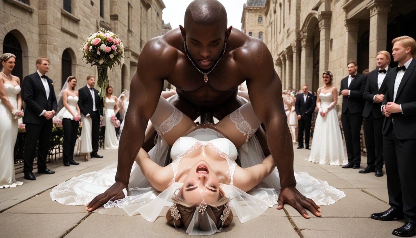 hermione as wedding bride, detailed face, full lips, blonde hair, hairbun, conservative white wedding dress, garter belt and sheer brown stockings, Louboutin conservative high heels, dress lift up, red lips in face, hourglass figure, wedding flowers, wedding bouquet, huge wedding cake, surprised, wide open mouth, hands holding her boobs, (interracial demon sex: 1.3), fucked by an aggressive large humanoid goat demon, surprised, missionary(3rd person)sex, sitting on a stone altar, rough fucking sex, legs spread wide, dark hairy pussy, rough sex, deep penetration, humanoid goat demon gritting teeth, monster has aggressive look, cum dripping down thighs, hard fucking, outdoors, flowering meadow, wedding guests watching, many people around, late afternoon, long deep shadows, specular lighting, creampie, impregnation, full body view