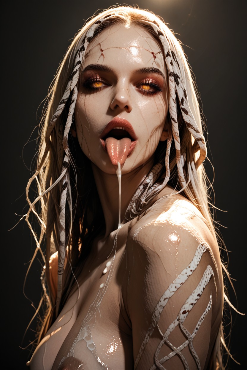 gorgon medusa from mythology, snake woman, long hair, (snake hair: 1.2), perfect skin, long nails, snake tail, long tongue, snake tongue, cum, cumshot, naked, sad, full body, warrior, defiant look, side view, front view, horror, dark background, beautiful face, sword and armor on the background, full body view