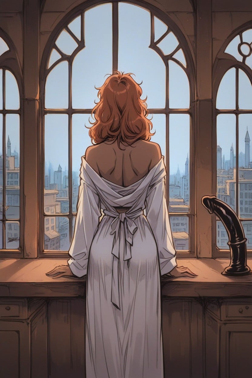 daphne from scooby doo, ginger hair, detailed face, very pretty, nubile body, tanned skin, wasp waist, perky breasts, long legs, white bathrobe, open robe, standing, messy hair, hotel bedroom, one large dildo on night table in background, modern hotel, sky scraper view out of window, skyline in background, standing in window, facing out of window, she is facing away from the viewer, she is holding her robe open, she is holding her robe open with both hands