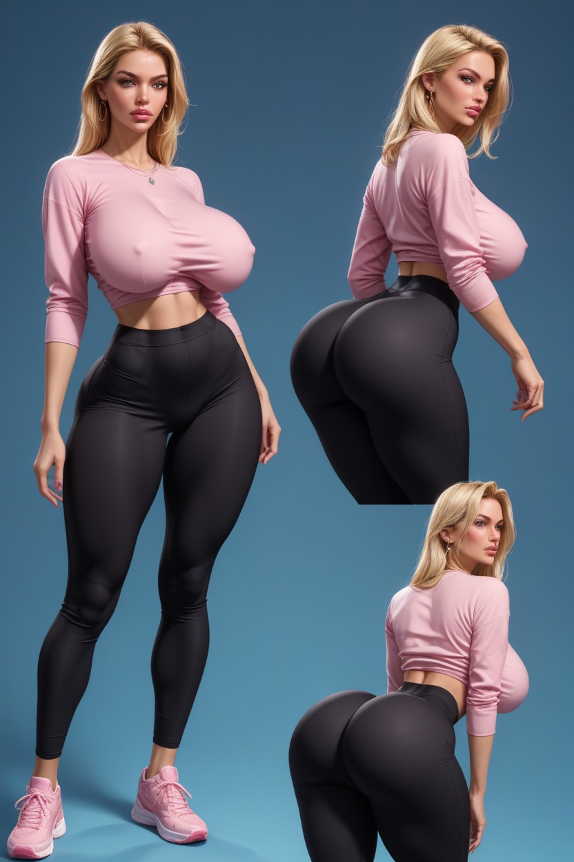 extremely big tits, extremely wasp waist, natural saggy tits, extremely waist, thick hips, extremely wide hips, extremely shoulders, extremely beautiful, slut, bimbo lips, extremely bulge ass, extremely squeeze boobs, extremely soft tits, touching tits, bubble butt, big butt, stand with legs wide apart, extremely tanned, blonde, abjusts tits, model pose, multiple poses, various angles, bending, flexible, bent over, pink oversized shirt, black yoga pants, sneakers, fit, milf, straight hair