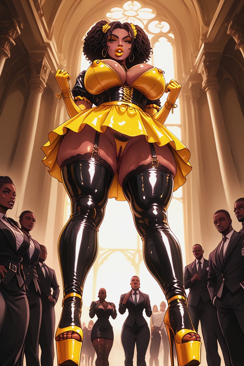 Futa Dark African ebony mistress woman breasts, wearing shiny maid outfit, wearing sexy black heels, wearing butt plug, wearing extremely big black in yellow latex skirt, everywhere, wearing latex yellow yellow frills on clothes, yellow ribbon in hair, huge breasts, nipple jewelry, exposed breasts, latex arm binder, exposed wet pussy, wearing yellow bow in hair, platform high heels, thigh high stockings with lace, yelling in shock, assholes visible, very detailed faces, detailed eyes, motion lines, hearts, show both women assholes hdr effect.