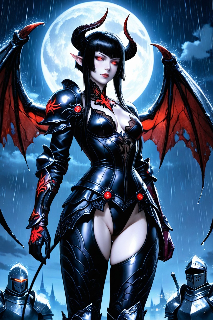 eliza from tekken, succubus, long straight hair, blunt bangs, black hair, pale skin, glowing red eyes, demon horns, big demon wings, elf ears, lean body, extremely waist, gothic, knight armor, full armor, full plate armor, night, moon, pale moon, big moon, full moon, moonlight, cold light, blue light, pale moonlight, cold moonlight, cold colors, raining, clouded, black plain background, standing, close up vagina, dark fantasy