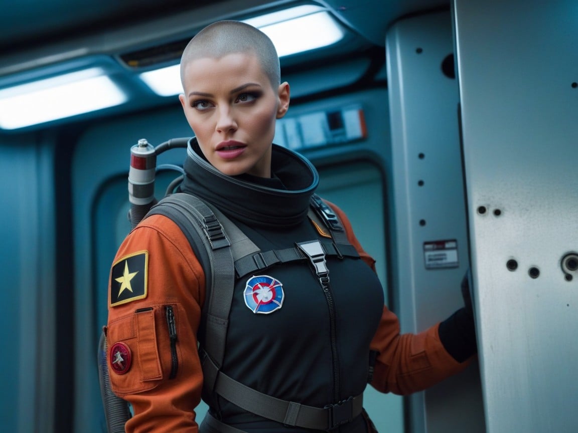 annalee call from alien resurrection, full body view, saggy droopy hanging natural breasts, fully clothed, nostromo, clean gleaming white scifi environment, restrained, clamped to spaceship wall, buzzcut pixie, very high side slits in her outfit which reveal her bare hips and waist, concealed by clothing
