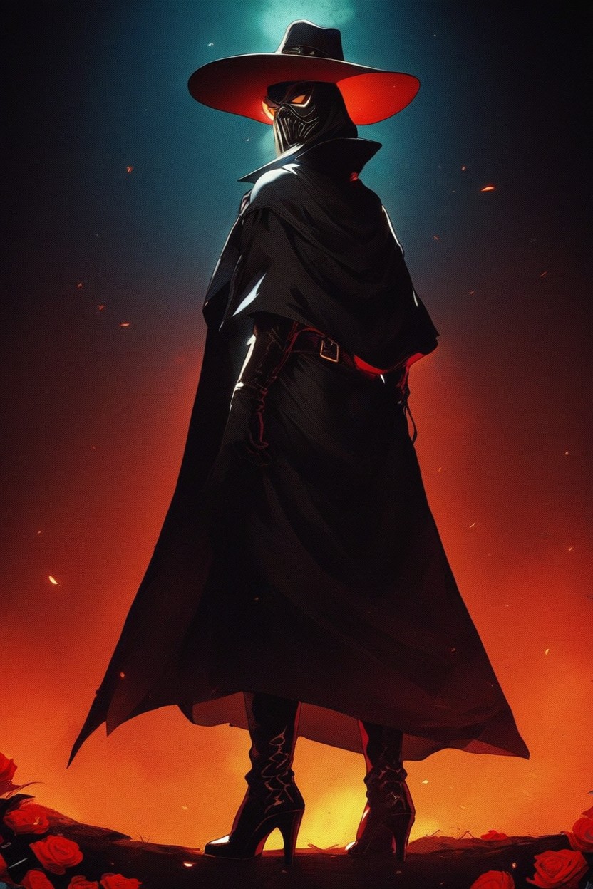 gothic style of clothing, back half cloak, brown leather boots with high heels, red medival clothing under cloak, leather belt, black leather hat with long brim, white plague doctor mask, round glasses on the mask, hands behind your back, brown leather gloves with wrist straps, red rose in the hand, 12th century style, looking at the viewer, night medival city, the glow of a fire on the horizon, high detailed