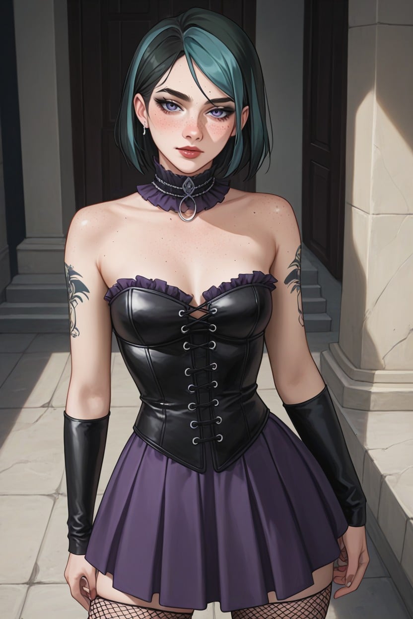 E l l I e from the last of us as gwen from total drama, freckles, hourglass body type, archetypal medium breasts, looking at viewer, medium shot, purple ruffle skirt, purple lace thong, fishnet stockings, goth boots, long legs, standing, orgasmic face, black corset, bare shoulders, at goth castle, forearm tattoo, closeup shot, top down view, anime style