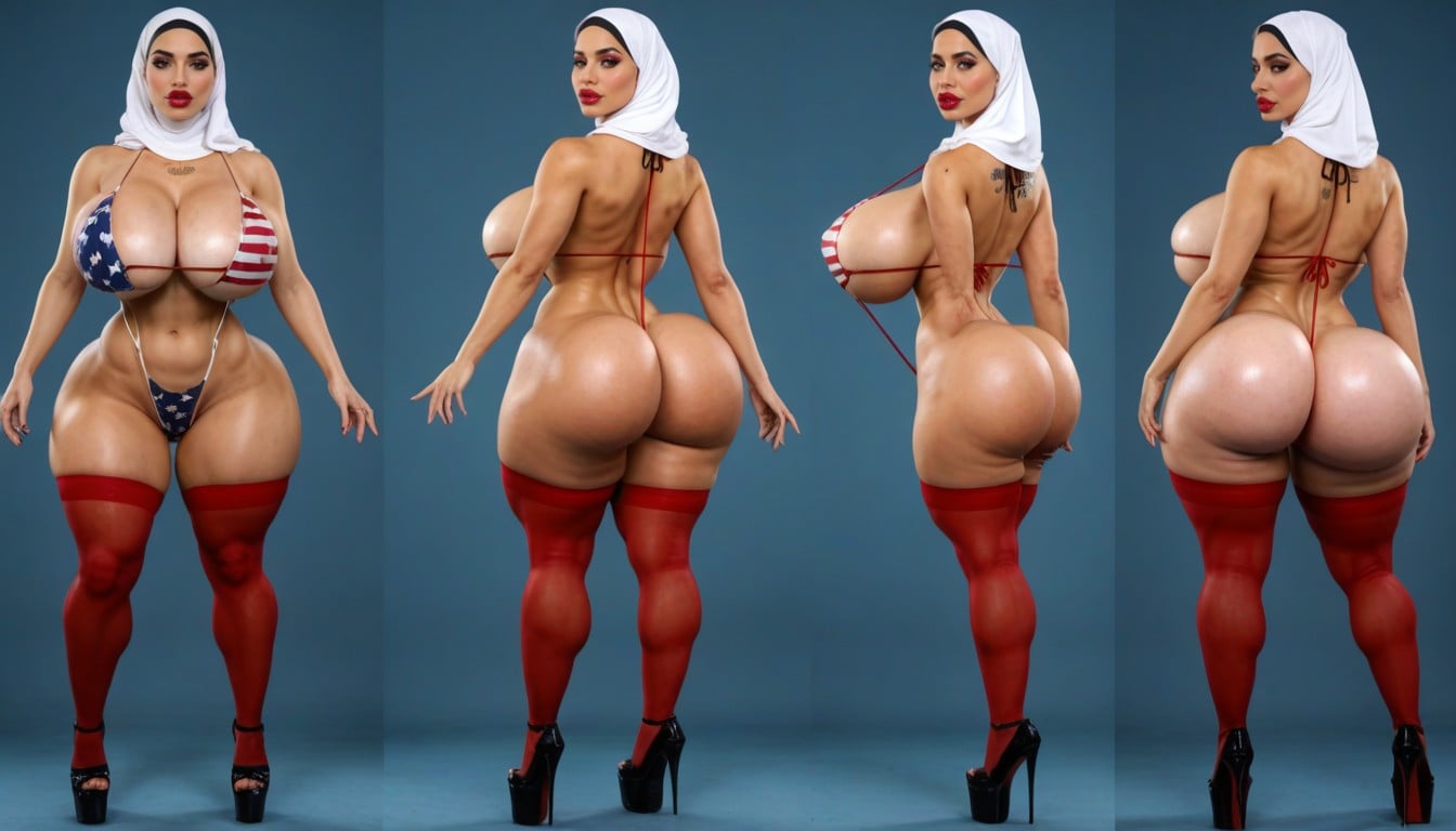 american flag hijab, milf, bimbo, giant lips, fake lashes, perfect anatomical body extremely beautiful face, attractive face, overflowing cleavage, american flag slingshot bikini, slutty expression, naked, perfect fake breasts, huge breasts, huge spherical breasts, hdr, (waist:1.2), wide hips, birthing hips, round hips, heart shaped ass, massive lips, (gigantic bimbo lips: 1.3), dark red lipstick, long fake lashes, (hyper wide hips: 1.3), insanely wide hips, hyper wide hips, bubble butt, hyper hips, curvy, tattoos, horny face, (massive bubble butt: 1.3), red platform heels thick thighs, massive ass, hourglass figure, wasp waist, rounded ass, hips bigger than torso, ass so big seen from the front, big extremely large buttocks bottom heavy, pear shaped, pawg huge rounded bubble butt, bbl blush, maximum highest details, full body, (specular:1.1), solid color background, multiple views, front view, back view, american flag nylon stockings, american flag bikini, squatting, legs spread