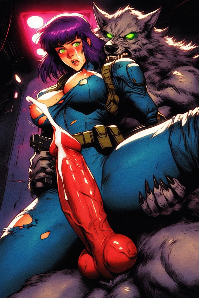asian, tan, dark purple hair, dark blue bodysuit open, breasts exposed, bodysuit unbuttoned, black boots, purple thong down, werewolf much bigger than woman, embarrassed, blush, detailed face, pretty eyes, erected nipples, boobs exposed, werewolf male horny, werewolf and woman, werewolf with big veiny dick, knot dick, beautiful face, beautiful face, werewolf leaning on, cumming a lot, werewolf drooling, visible cumshot from thick and veiny big cock from assjob in reverse cowgirl position, cum dripping along his cock, he is grabbing her ass, her arms around his neck, spread legs, detailed faces, wide view, side view, fingerless gloves, grey tactical belt, pistol in a holster on the belt, woman hold gun, werewolf hold woman hand, werewolf grab woman hand, tactical pads, bottomless, torn clothes