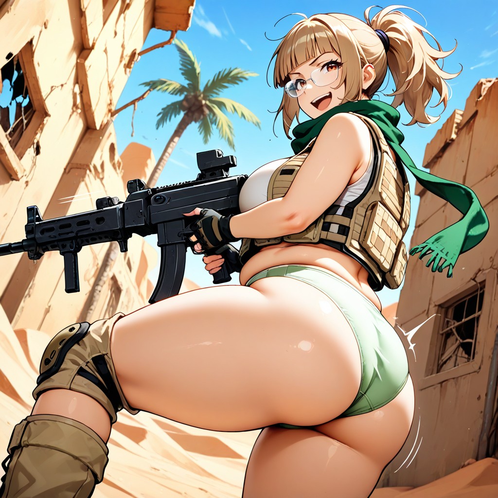 fio medium length, light brown hair, ponytail, blunt bangs, khaki cap, clear rounded glasses, opens khaki tactical vest, white croptop underneath, the other female is Eri kasamotometal slug character, is in the sidecaraiming a mounted heavy machine gun), eri with long blonde hair, messy hair, ponytail, wearing an olive green scarf tied around her head, with some front hair strands peeking out, and a white crop top underneath her opens olive green tactical vest, they both wearing a khaki seamless panties, khaki knee pads, khaki high-boots, fingerless gloves, abandoned buildings with broken windows and palms tree in the background, speed lines, fast lines, in the vast of the desert, wide angle, rear-side view, vibrant color, sharp focus, prominent large ass, laughing, smirking