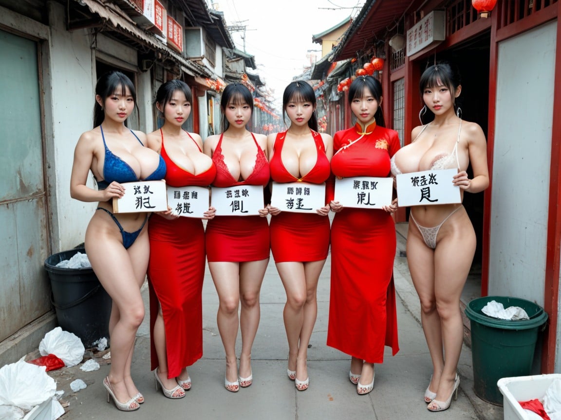 (chinese freeuse breeding whores:1.3), chinese hair details, (filthy chinese breeding stall:1.3), hyper realism, sexy chinese whores, group, exposed perfect pussy, full body, front view, looking at viewer, trash, chinese style hair, chinese bangs, chinese whore harem, curvy lips, detailed chinese faces, pretty chinese faces, blushing, perfect chinese skin, chinese, lean body, huge natural breast, cleavage, massive breasts, tight thighs, long eyelashes, hdr, photographic, very attractive chinese faces, begging for cum, filthy trash, facing viewer, extremely large eyes, highly detailed eyes, perfect body, black hair, perfect legs, tight body, (filthy breeding stall:1.3), disgusting urinal, extremely filthy, chinese whores begging to be bred, (disgusting chinese breeding outhouse:1.3), chinese outhouse, (highly detailed chinese breeding whores:1.3), bare feet, large head, larger head, urinal, excessive filthy trash, standing, detailed overused massive pussy, whoring, holding sign