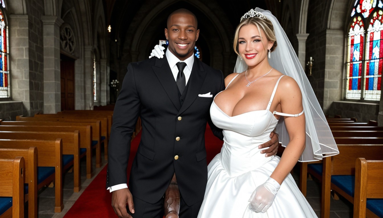 arielle from pokermon, white bride lady, white bridegroom, excellence wedding dress, groom embracing bride, red lips, most beautiful face, tight wedding dress, high heels bride shoes with double straps, admiring cock, embarrassed smiling at size of cock, interracial, black priest standing next to bride, muscular priest with exposed cock, black priestrobe and white collar, bbc, interracial, massive extreme thick black cock, bbc, veiny black cock, giant muscular, size comparison, giant hyper cock, muscular Black man, intense penis, thick cock